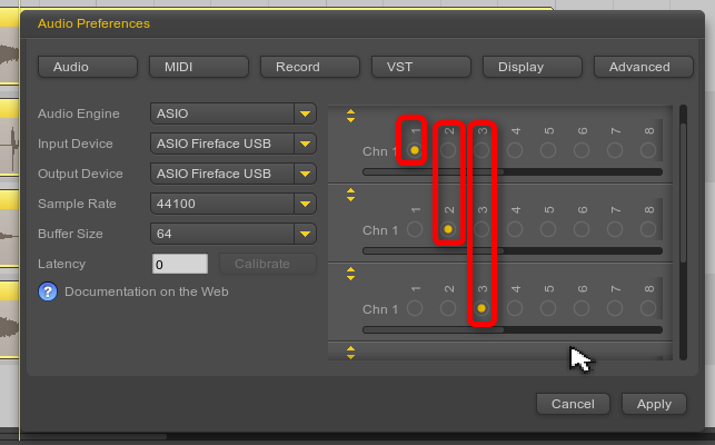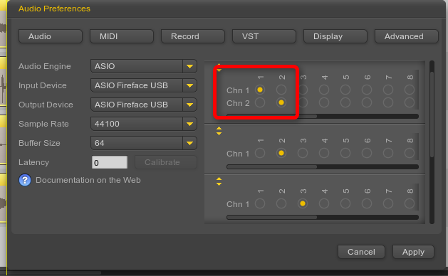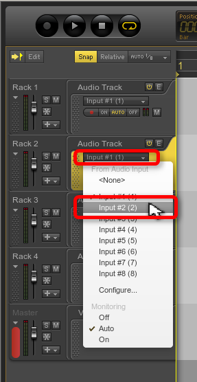 - ch1は1、ch2は2と、それぞれに入力チャンネルを割り振ります。