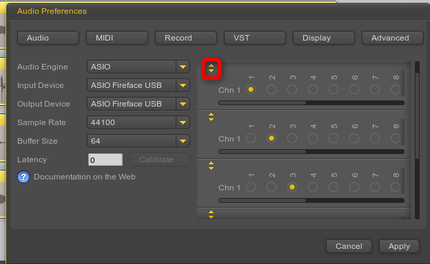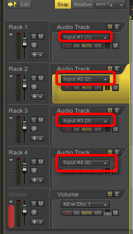- ステレオ入力を作る場合は赤枠内の上矢印をクリックして、2チャンネル分割り当てます。