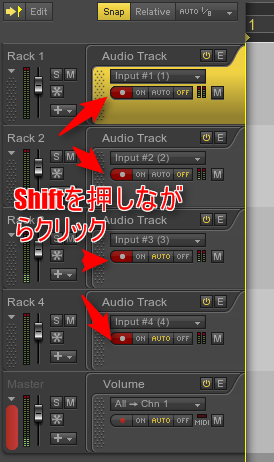 最後に「Shift」を押しながら録音ボタンをクリックして、録音したいトラックをRec待機モードにしましょう。