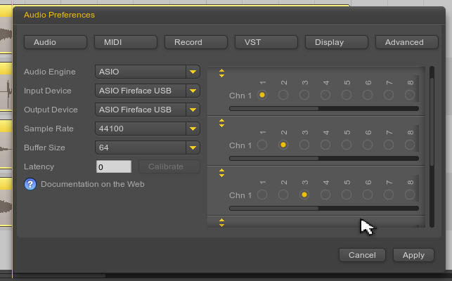 まず初めに、オーディオインターフェイスの入出力の設定をします。