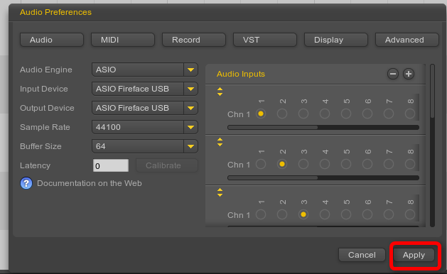 - 「Audio」タブ内の「AudioInputs」の横にある「+」ボタンを必要な数だけ押します。